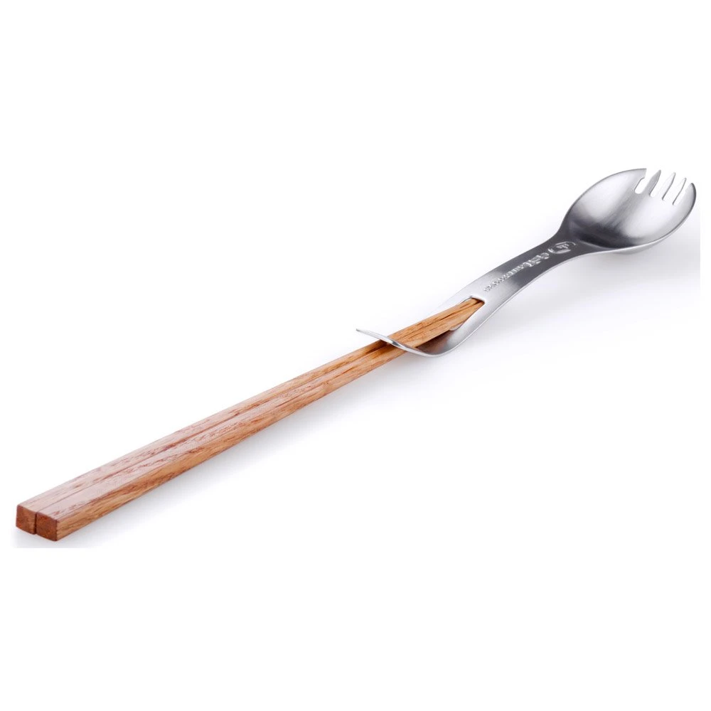 DasGSI Outdoors-Kochgeschirr Kung Foon ist eine Kombination aus einem Gabel-Löffel-Hybrid und einem Paar chinesischer Essstäbchen. Wenn sie zusammengesteckt werden, entsteht ein langer Löffel, der sich perfekt zum Abkratzen des Bodens eines Gerichts eignet (Achtung, nicht den Boden eines Topfes, da Sie ihn sonst zerkratzen könnten).
