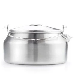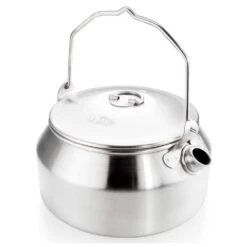 Der Glacier Stainless Tea Kettle aus Edelstahl von GSI Outdoor ist perfekt für Camper oder Wanderer, die langlebiges Material mit traditionellem Design wünschen. Er hat ein Fassungsvermögen von 1 Liter, lässt sich leicht von oben befüllen und wird während des Kochens mit einem Klappgriff verriegelt, was für zusätzliche Sicherheit sorgt.