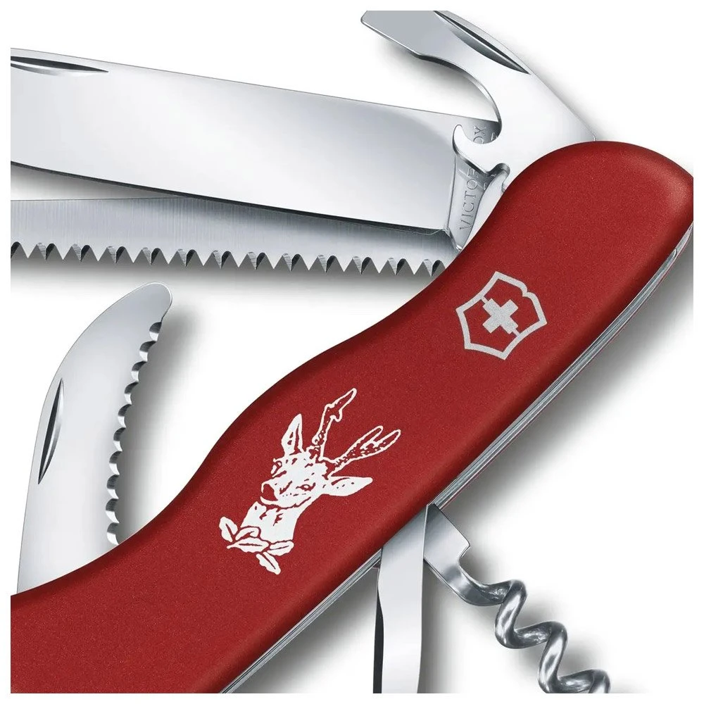 Das Victorinox Hunter ist ein Schweizer Messer , das für Jäger und andere Outdoor-Aktivisten entwickelt wurde. Die große, feststellbare Klinge ist vielseitig einsetzbar und wird durch eine kleine Klinge zum Häuten von Wild sowie eine Holzsäge ergänzt. Der Korkenzieher, der Dosenöffner und der Flaschenöffner wiederum werden sich perfekt für Ihre geselligen Momente eignen.