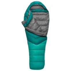 Der Damenschlafsack Alpine 400 Womens der Marke Rab ist ein 3-Jahreszeiten-Modell in Sarkophagform. Er ist relativ vielseitig und begleitet Sie in den Bergen beim Wandern, Bergsteigen oder Radfahren. Die Pertex Quantum Hülle ist winddicht und verfügt über eine wasserabweisende DWR-Behandlung, die für Trockenheit sorgt. Sie enthält Entendaunen, die als Kälteisolatoren gelten, in trapezförmigen Trennwänden, um Kältebrücken zu vermeiden. Der 3D-Kragen, ebenfalls aus Daunen, zieht sich zusammen, um die Wärme im Inneren zu halten. Die Daunen sind RDS-zertifiziert, was für einen Rohstoff steht, der den Anforderungen des Tierschutzes entspricht.