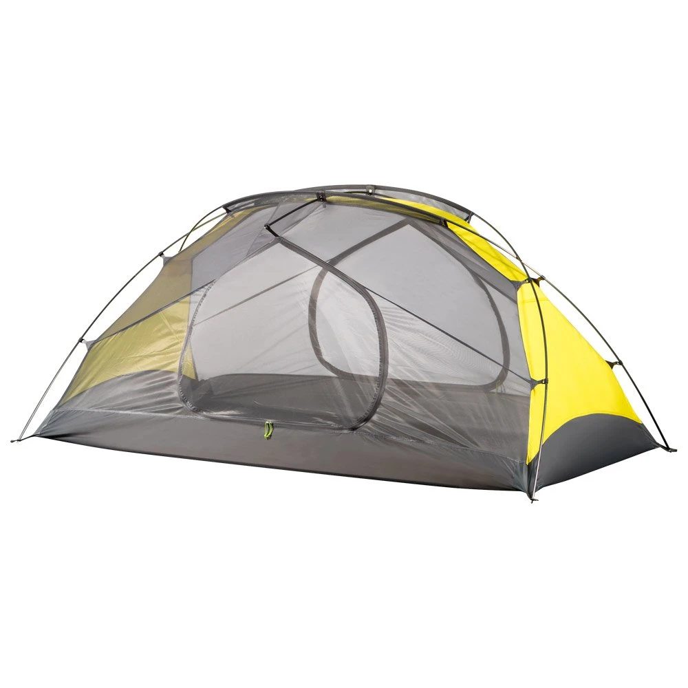Das Salewa Denali II Zelt ist kuppelförmig gestaltet und bietet zwei Personen die Möglichkeit, unter optimalen Bedingungen zu campen, geschützt vor Wind und Regen. Das mit Polyurethan beschichtete Außenzelt und der Zeltboden sind wasserdicht und Belüftungsöffnungen sorgen dafür, dass überschüssige Feuchtigkeit entweichen kann und die Luft ausgetauscht wird. Die Türen verfügen über Moskitonetze und können auf verschiedene Arten geöffnet werden, während zwei Apsiden Platz zum Verstauen von Sachen und zum Kochen bieten. Das Denali II ist ideal, um auf mehrtägige Wanderungen zu gehen. Nach einer erholsamen Nacht wacht man in einer traumhaften Landschaft auf.